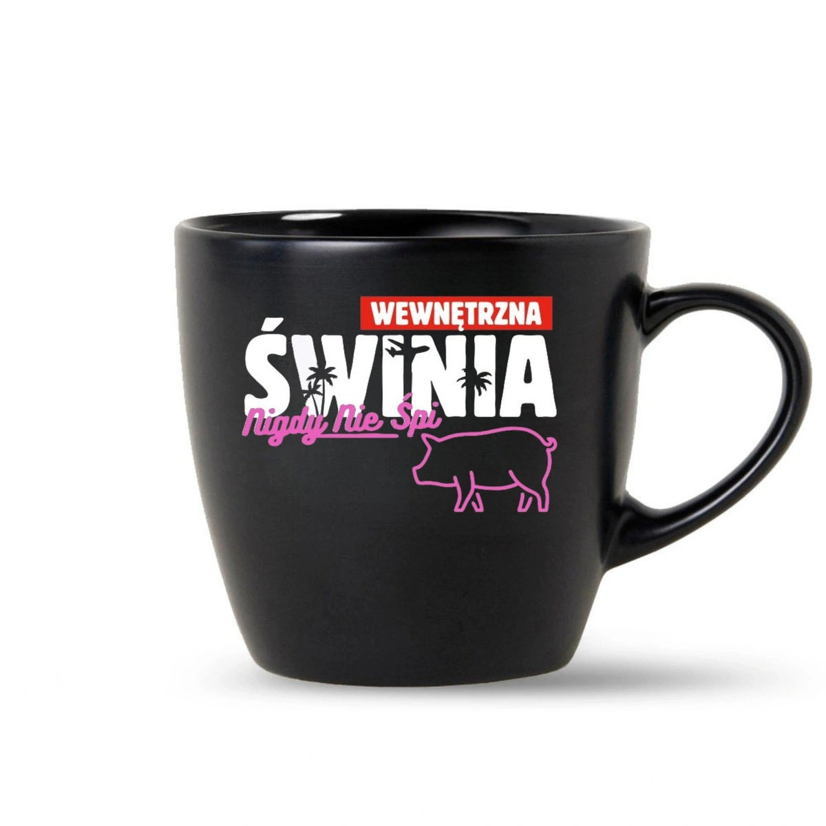 Czarny kubek ceramiczny klasy premium z połyskowym, czarnym wnętrzem. Zewnętrzny nadruk motywacyjny z legendarnym hasłem: Wewnętrzna świnia nigdy nie śpi, poprawi Ci dzień! Wnętrze zaś zdobi hashtag #tylkoketoza.