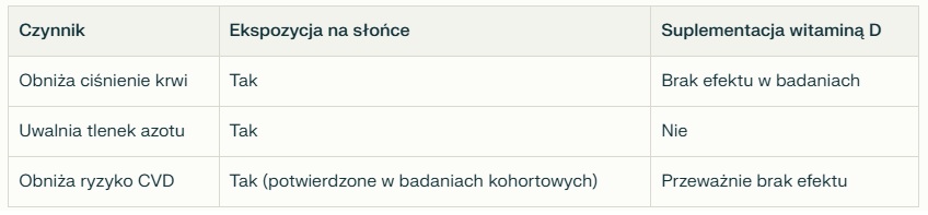 Kolejne szeroko zakrojone badanie [2] potwierdziło, że ciśnienie tętnicze jest niższe latem, kiedy promieniowanie słoneczne jest najwyższe. Nawet krótka ekspozycja na słońce pozwala skórze wytworzyć ogromne ilości witaminy D, co ma zasadnicze znaczenie dla zdrowia, a niedobory tej witaminy wiążą się z wyższym ryzykiem chorób serca, miażdżycy i ogólnej śmiertelności. Jednakże, co istotne w tym badaniu, sama suplementacja tą witaminą nie przyniosła równoważnych korzyści co ekspozycja na słońce. Oprócz syntezy witaminy D, “dawka słońca” korzystnie wpłynęła na układ krążenia, co oznacza, że same suplementy nie zastąpią pełnych prozdrowotnych efektów ekspozycji na słońce: