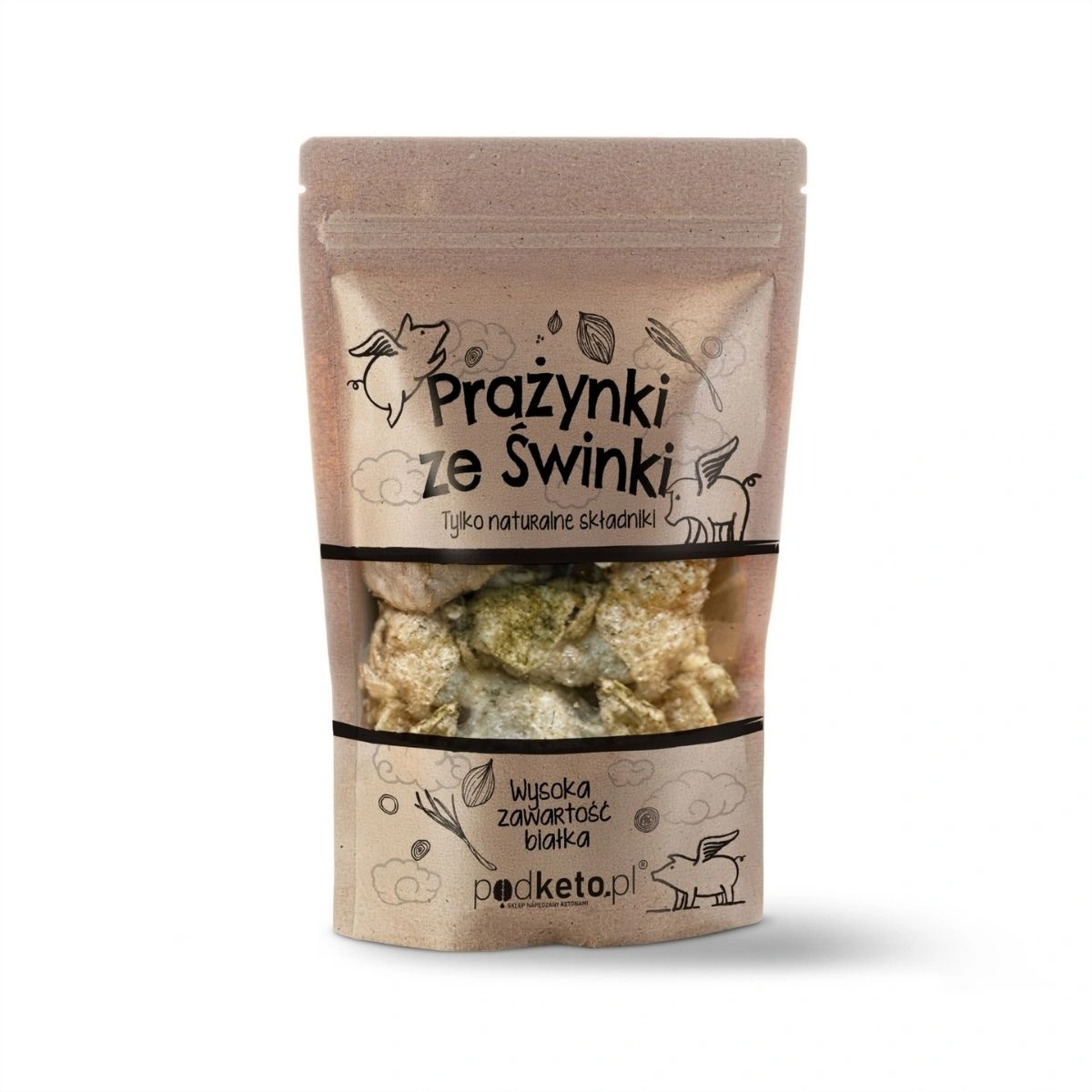 - Prażynki ze świnki – chrupiąca keto przekąska o smaku zielonej cebulki, z wysoką zawartością białka i tylko naturalnymi składnikami. Idealne dla osób na diecie niskowęglowodanowej i keto, bez konserwantów.
