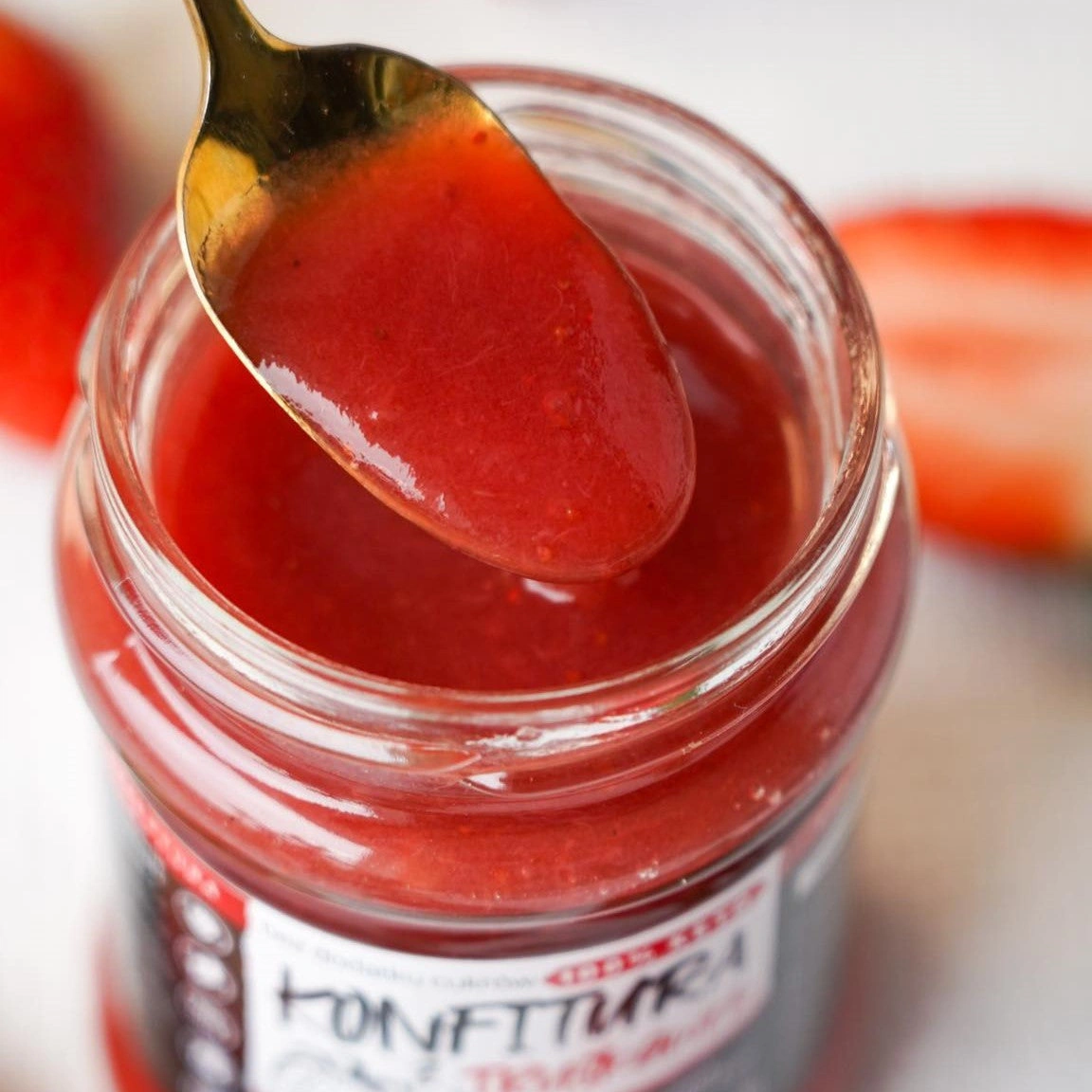 Uwaga: w konfiturach bezpośrednio wyjętych z lodówki, może być wyczuwalny skrystalizowany erytrytol, który ma naturalne tendencje do wytrącania się w niskich temperaturach. Konsystencja wyrobu wraca do pierwotnej w temperaturze pokojowej.