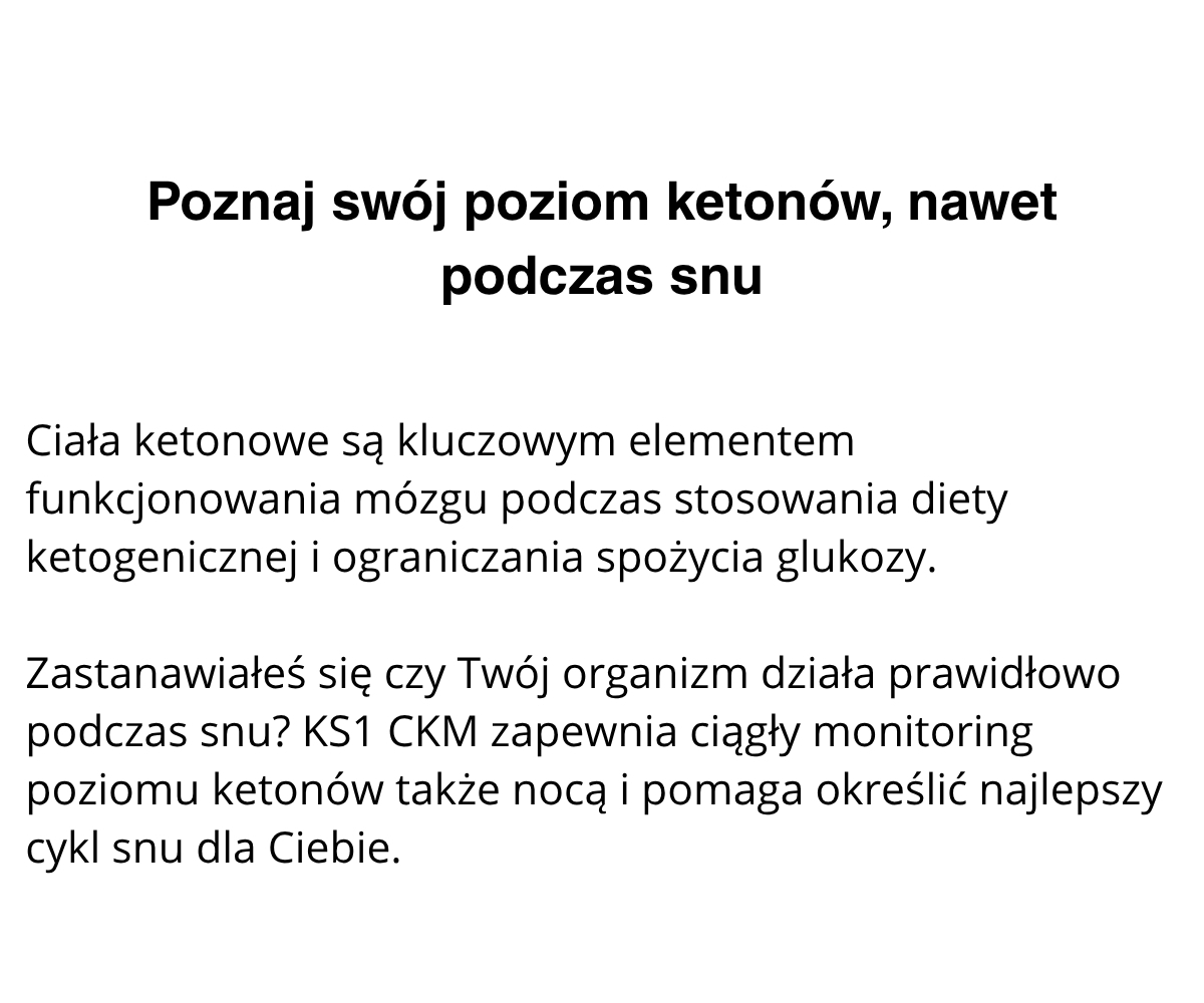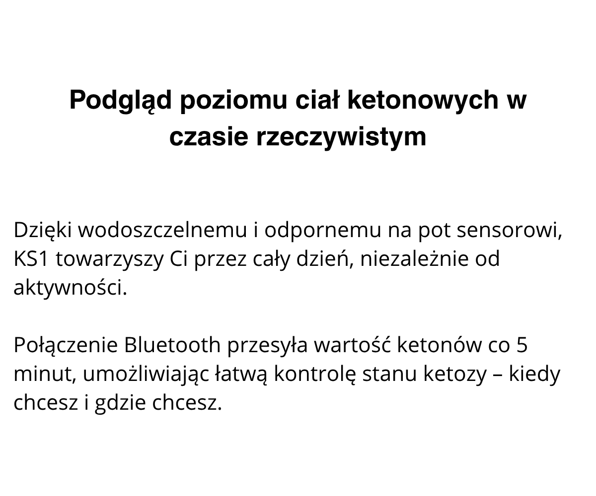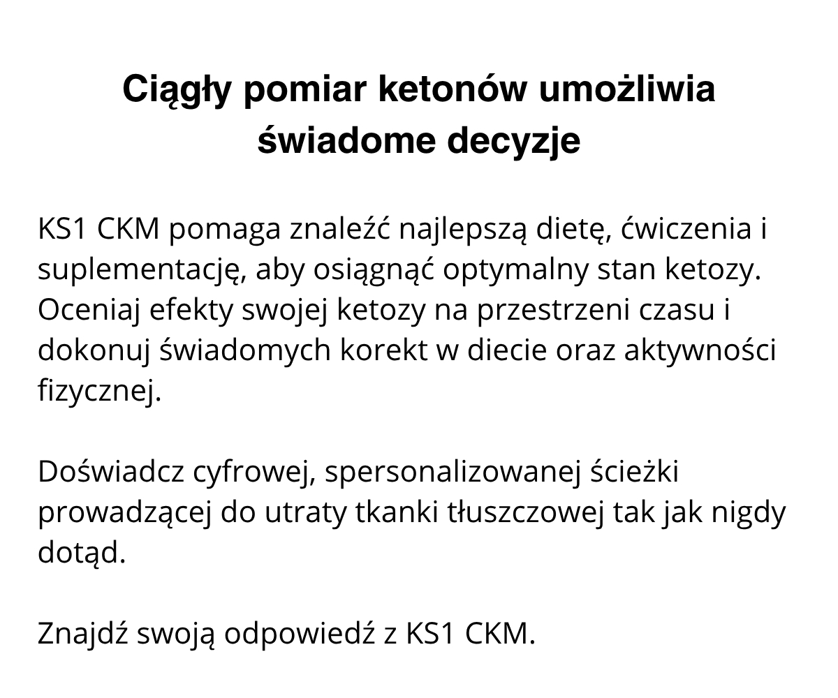 KS1 to minimalnie inwazyjny sensor, działający nieprzerwanie do 14 dni, przesyłający dokładne dane do aplikacji mobilnej w czasie rzeczywistym. Dzięki temu w prosty sposób kontrolujesz poziom ketonów, lepiej dopasowujesz dietę oraz trening, a także szybciej osiągasz swoje cele żywieniowe i sylwetkowe. Idealny dla osób, które chcą w pełni wykorzystać potencjał diety ketogenicznej i podejmować decyzje na podstawie realnych danych.